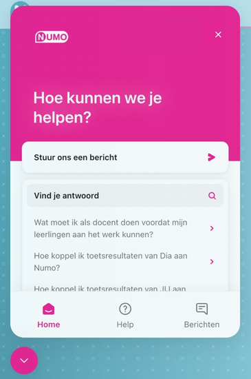 Ga naar mijn.numo.nl en log in. Links onderin het scherm vind je een roze help-knop. Klik je daarop, dan krijg je direct toegang tot: